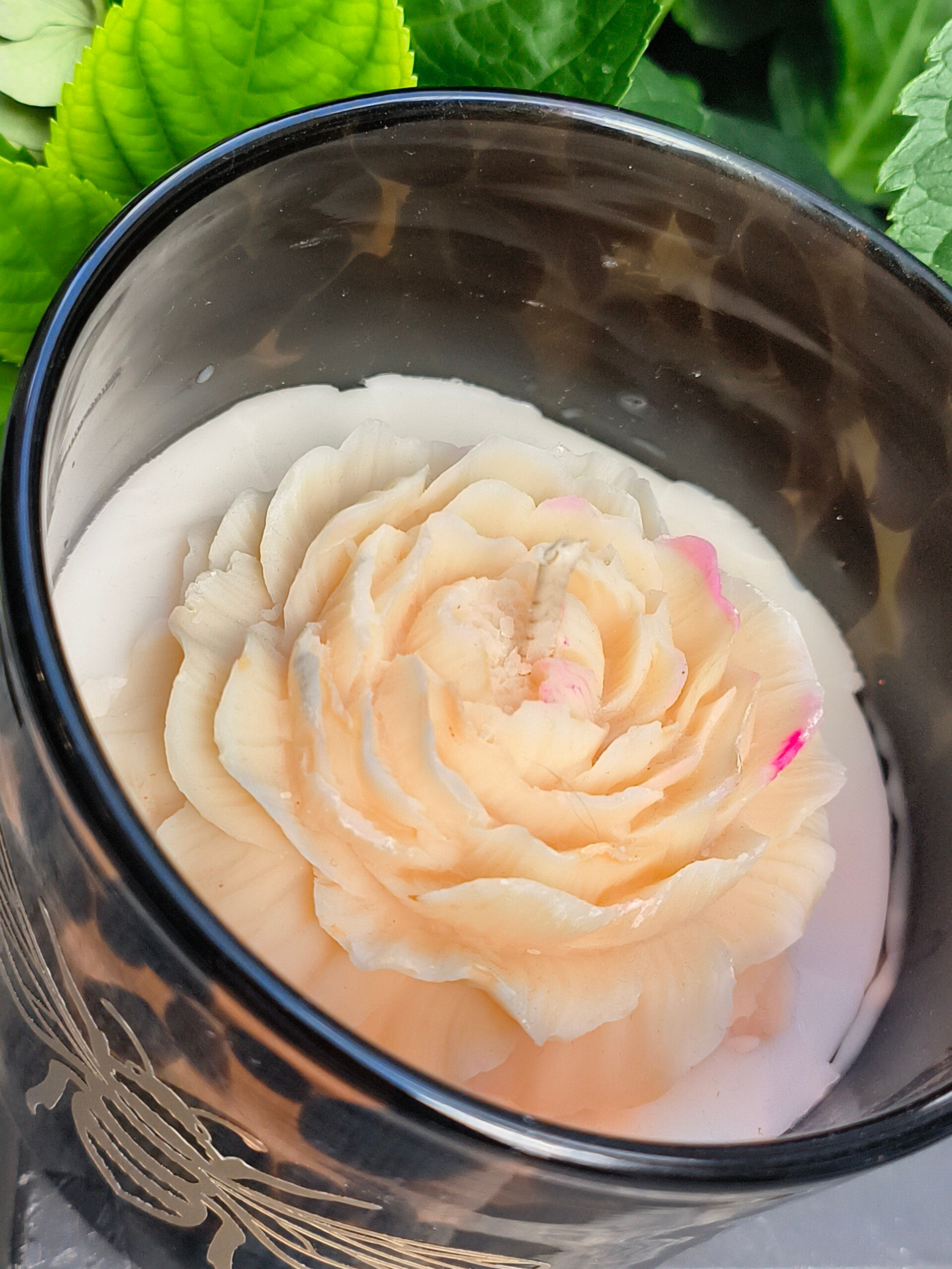 Son cœur renferme une cire onctueuse où repose, telle une couronne, une pivoine délicatement déposée à la main, symbole de grâce et de féminité.