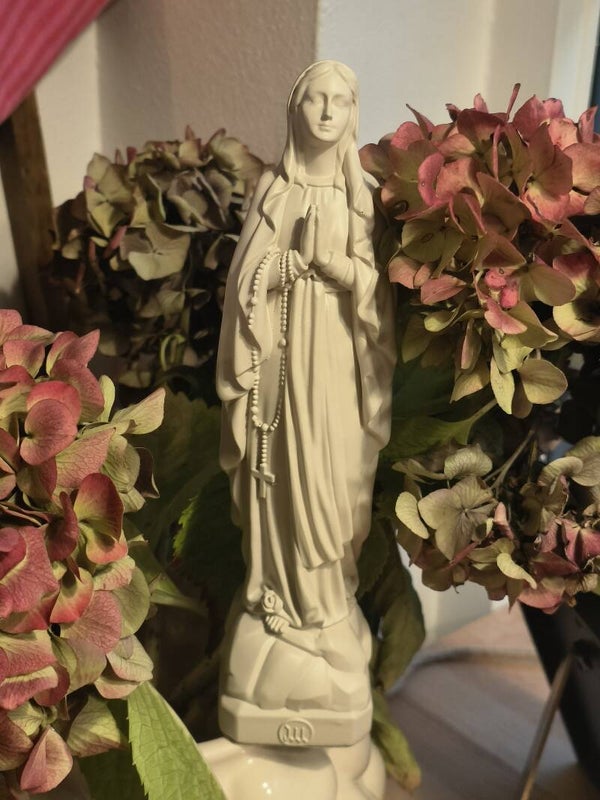 Cette statue de la Vierge de Lourdes revisite les codes de l’art sacré avec une touche pop et design, mêlant spiritualité et décoration contemporaine.